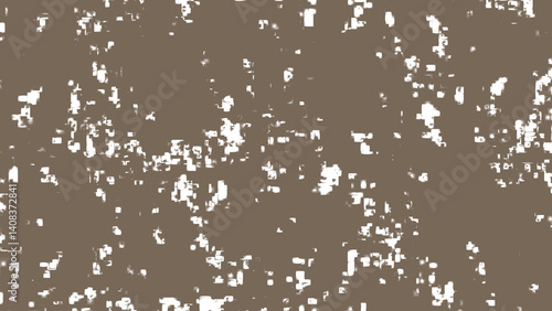 Brown background featuring scattered white square shapes forming pixelated digital pattern suggesting fragmented visual texture with geometric distortion