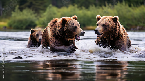 brown bears wading in a river, surrounded by lush greenery and water splashes, brown bear in water