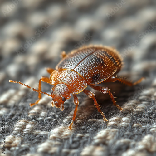 Brown beetle crawling on carpet.
