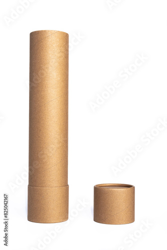 Brown cardboard cylinder tube for shipping isolated on white background. Top removed