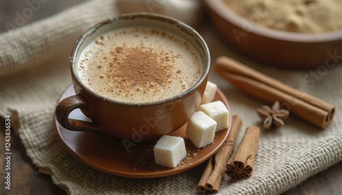Brown Ceramic Cup With Chai Milk Tea And Cinnamon On Wooden Table
