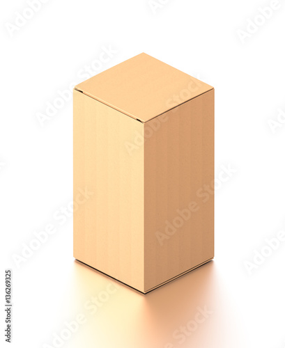 Brown corrugated cardboard box from isometric angle. Blank, vertical, and rectangle shape.