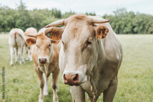 brown cow with horn in a field