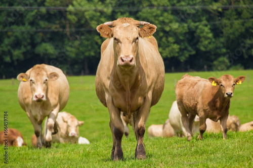 brown cows on the green pasture in summer