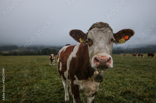 Brown cows with a white pattern on a mountain. Foggy autumn morning in the alps