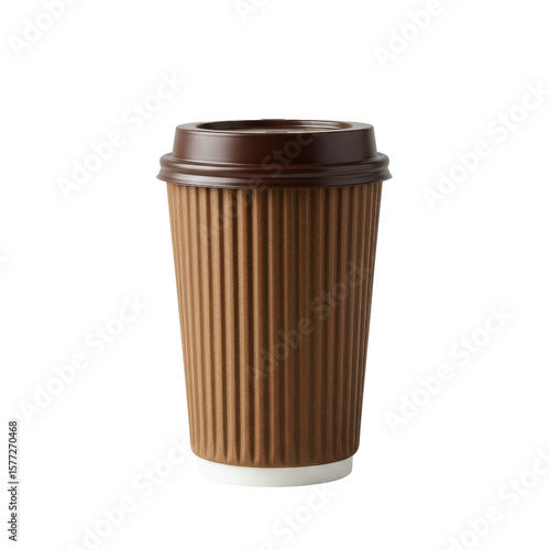 Brown disposable coffee cup with ribbed texture on white background