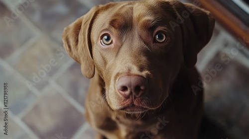 Brown dog with expressive eyes sitting on tiled floor showcasing loyalty and warmth in a cozy indoor setting.