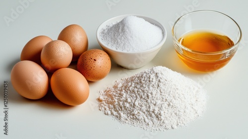 Brown Eggs, Flour, Sugar, and Honey Baking Ingredients on a Light Grey Surface