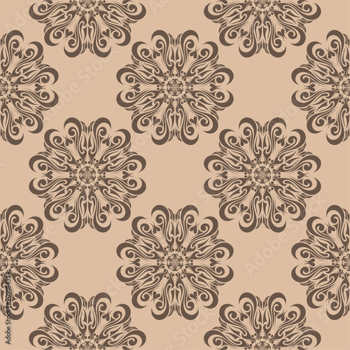 Brown floral ornament on beige background. Seamless pattern