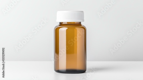 Brown glass bottle with white cap on a neutral background, perfect for medical and laboratory concepts.