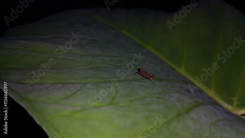 Brown grasshopper on a taro leaf. The brown grasshopper is still small. Shot in the jungle.
