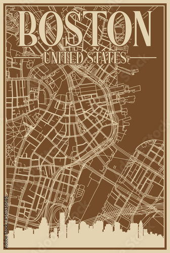 Brown hand-drawn framed poster of the downtown BOSTON, UNITED STATES OF AMERICA with highlighted vintage city skyline and lettering