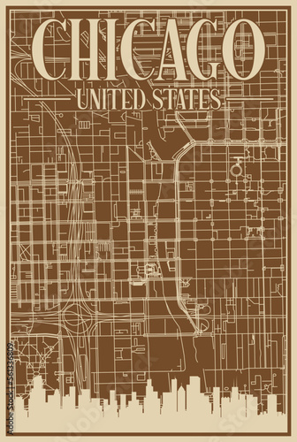 Brown hand-drawn framed poster of the downtown CHICAGO, UNITED STATES OF AMERICA with highlighted vintage city skyline and lettering