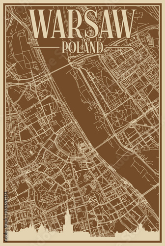 Brown hand-drawn framed poster of the downtown WARSAW, POLAND with highlighted vintage city skyline and lettering