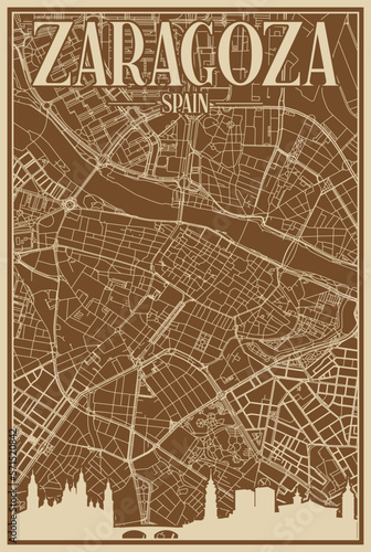 Brown hand-drawn framed poster of the downtown ZARAGOZA, SPAIN with highlighted vintage city skyline and lettering