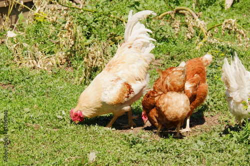Brown hens and yellow rooster on the farm. Chickens walk on the grass in the farmyard. Selective focus.