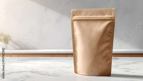 Brown kraft stand-up pouch mockup on white marble surface in kitchen interior with soft light for product branding or packaging design presentation.