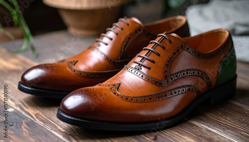 Brown leather brogues on wooden table
