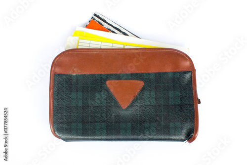 Brown leather document bag with dark green checkered pattern, isolated on white.