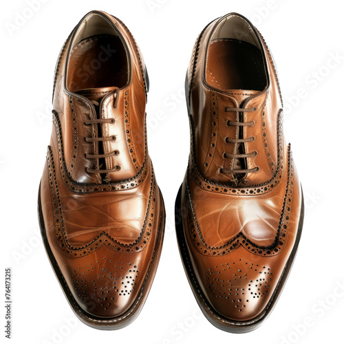 Brown leather oxfords shoes with intricate detailing, cut out transparent