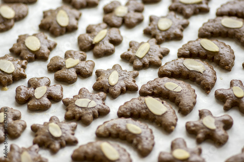 Brown moravian dark gingerbreads with sliced almonds on white baking paper one by one, christmas cookies, Variety of shapes