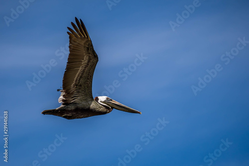 Brown Pelicans flying along the coastline of Padre Island NS, Texas