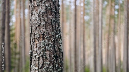 brown pine tree trunk, bark with bluish northern moss, beautiful pattern, texture, nature, forest in background, international earth day, ecology and environmental protection concept, copy space