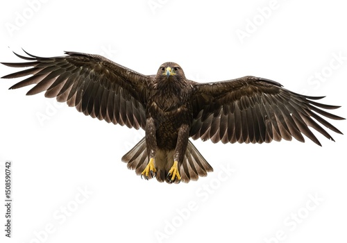 Brown raptor in flight against white background