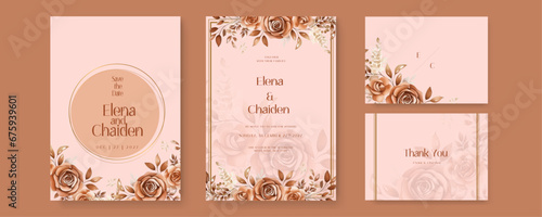 Brown rose vector wedding invitation card set template with flowers and leaves watercolor