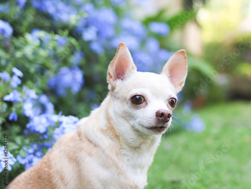 brown short hair Chihuahua dog sitting on green grass in the garden with purple flowers blackground, looking away curiously, copy space.
