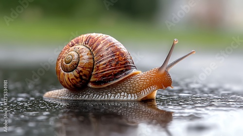 Brown Snail Crawling on Wet Dark Surface with Green Background