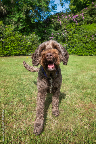 Brown Sprockapoo dog - Springer Cocker Poodle cross - playng in a field