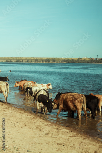 Brown, white, black cows stand in the water near the shore against a blue sky