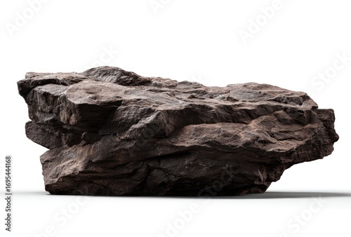Brownish rock, with textured surfaces and sharp edges, lays isolated on a bright white surface with a soft shadow