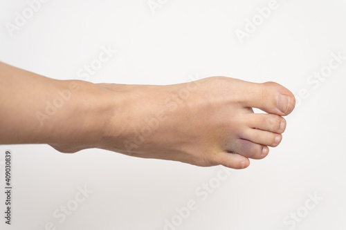 Bruise on the foot. Hematoma after injury to the ring toe of the left foot. Female injured limb on a white background.