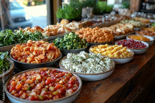 Brunch spread with a variet of dishes pastries. Village Breakfast with pastries, vegetables, greens, spreads, cheeses, fried eggs, jams.