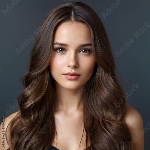 Brunette girl with long and shiny wavy hair . Beautiful model with straight hairstyle .