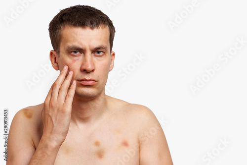 Brunette man with bruises on his body holds his hand to his head in pain after a fight on a white isolated background. Health and medicine.