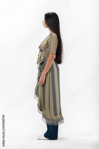 brunette posing in clothes for a catalog on a white background