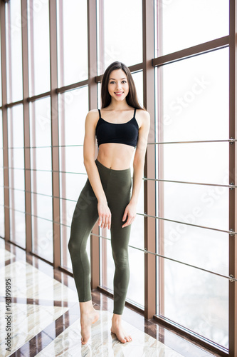 Brunette sexy fitness girl in sport wear with perfect body in the gym posing before training set
