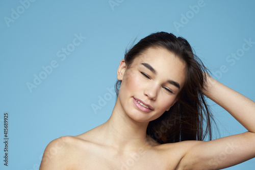 brunette with bare shoulders cosmetics close-up skin care blue background