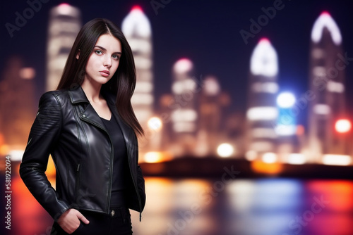 Brunette woman black leather jacket stands against backdrop night urban landscape with lights on buildings.Generative AI.