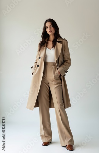 Brunette woman models chic autumn outfit in studio. Trench coat and tailored pants create elegant style. Fashion model poses confidently. Grey background, natural light. Cozy seasonal look.