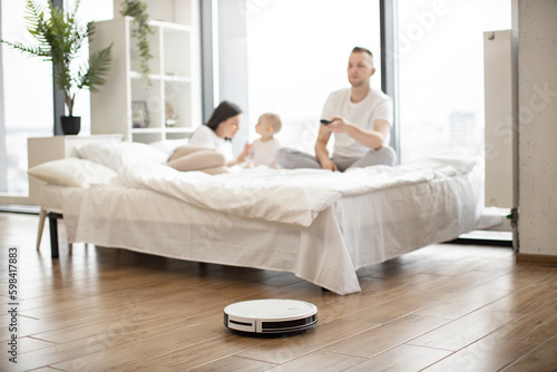 Brunette woman playing with infant girl on bed while young man turning on robot vacuum cleaner via remote control in studio room. Modern family resting at weekend using one touch home cleaning.