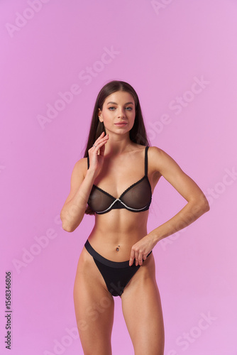 Brunette woman posing confidently in elegant black lingerie set, featuring sheer bra and black panties, with hand near face and neutral expression against soft lighting