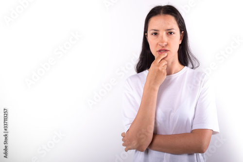 Brunette woman thoughtfully looking at camera with passing smile. Hand on chin