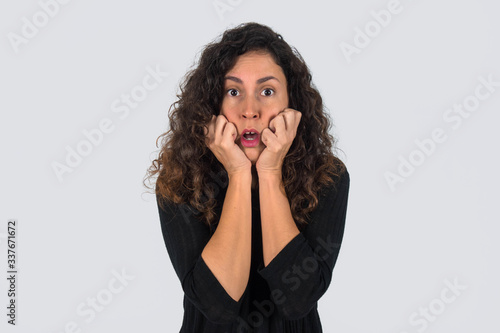 Brunette woman with curly hair dressed in black. Pretty girl with expression of fear and terror.