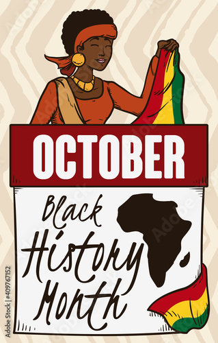 Brunette Woman with Flag and Reminder for Black History Month, Vector Illustration