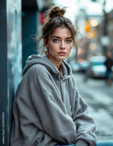 Brunette woman with green eyes and messy bun standing in an urban area during daytime