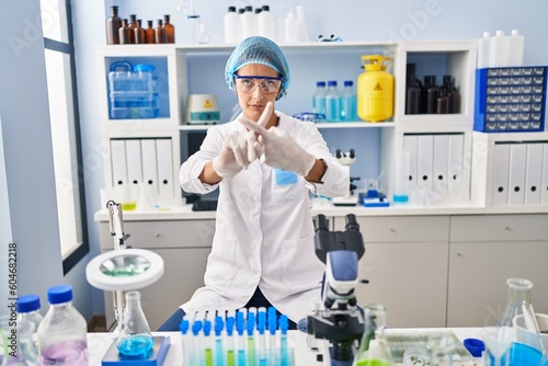 Brunette woman working at scientist laboratory rejection expression crossing fingers doing negative sign